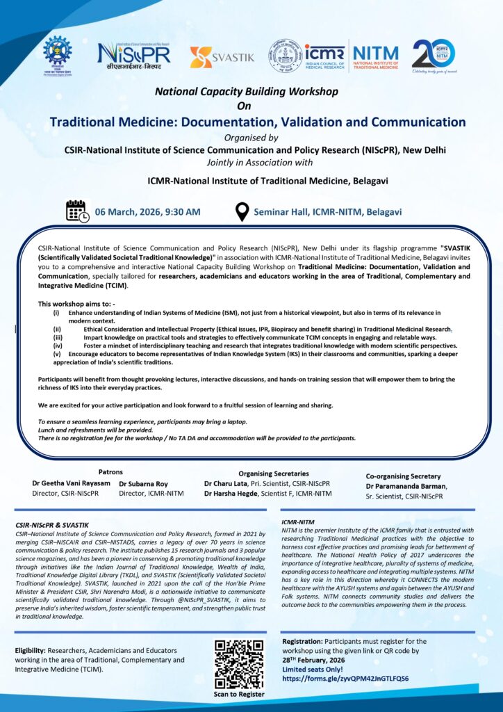 The focus of research on Traditional Medicine includes lifestyle and metabolic diseases, geriatric and mental disorders, viral infections, difficult to treat illnesses, and some forms of cancers. NITM works at the interfaces of Traditional Medicine [Codified (AYUSH) and Non-Codified (Folklore/Ethnomedicine)] and Modern Medicine, Community/Hospital and Laboratory, Research and Practice at the Health Systems level. The domain of activities in Traditional Medicine includes documentation of practices, pharmacoepidemiology, pharmacovigilance, laboratory validation of apparently safe/ useful practices (in silico, in vitro), pre-clinical studies (on toxicity/safety as well as efficacy), and clinical evaluation. Ethnomedicine, Natural Product Chemistry, Pharmacology, Microbiology, Molecular Biology, and Bioinformatics are the laboratory Departments at NITM. The Health Systems Department carries out studies in community and hospitals in Operational /Implementation Research mode on Pharmacology, Pharmacovigilance, and Social Sciences.