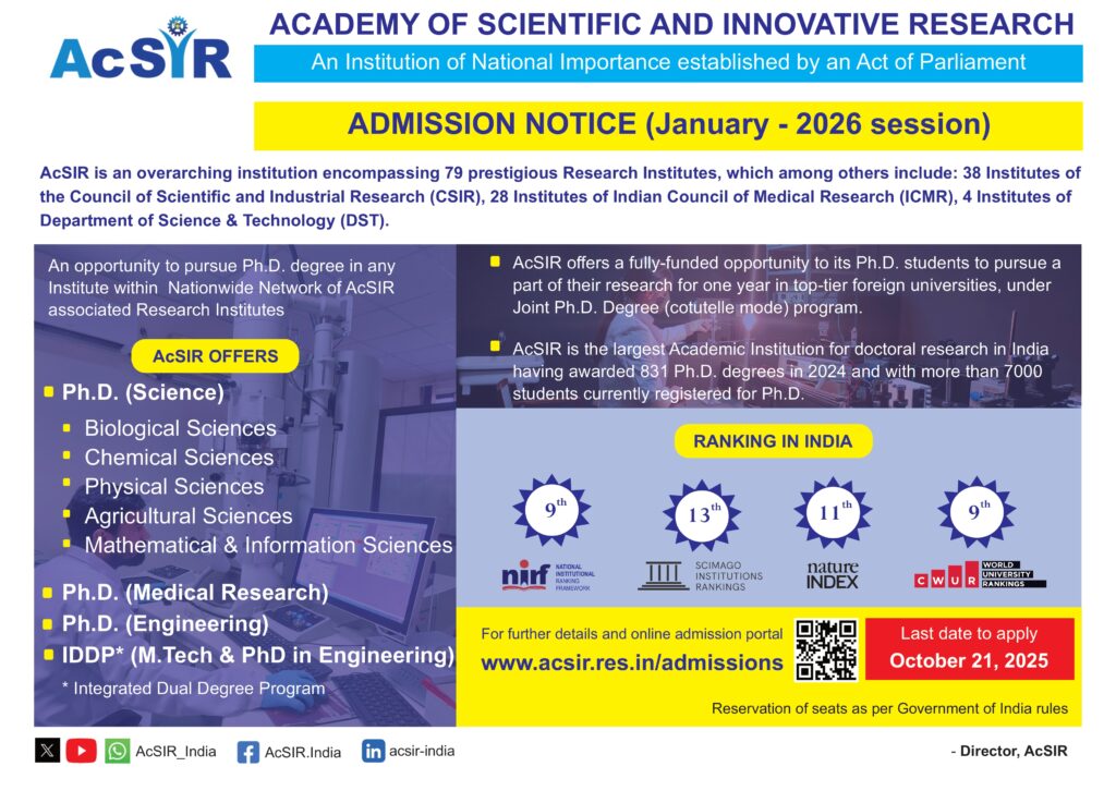 The announcement for admission to PhD programs for the August 2024 session under the Academy of Scientific & Innovative Research (AcSIR) has been issued. The PhD program in Medical Research is available at institutes of Indian Council of Medical Research, Department of Health Research, Ministry of Health and Family Welfare, Government of India.